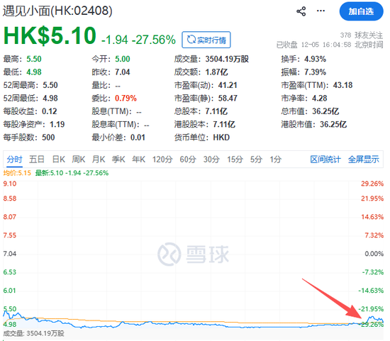 抵制收盘,碰见小面跌幅超27%,当日成交额1.87亿港元,换手不到5%,最终收盘市值36.25亿港元。