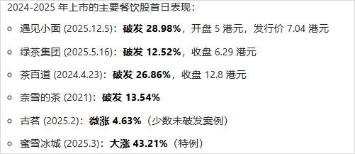 除了“雪王”蜜雪冰城这一特例外,绿茶集团、茶百谈、奈雪等齐出现不同经过的破发。