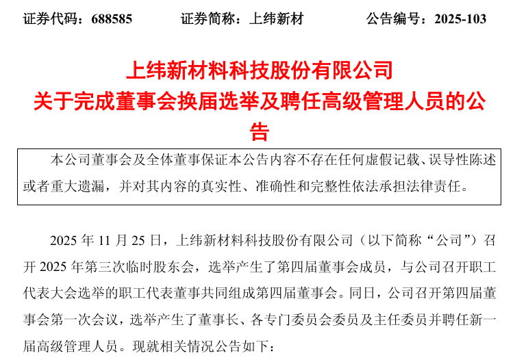 11 月 25 日晚,上纬新材公告称,当日公司召开了 2025 年第三次临时鼓励会,通过集会投票制的情势选举了彭志辉、田华、周斌、姜青松、钮嘉为公司第四届董事会非颓唐董事。IT之家详确到,这五东说念主均为智元体系的中枢主干。