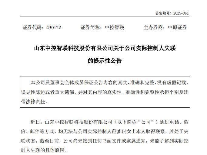 公告走漏,近日,山东中控智联科技股份有限公司(以下简称“公司”)通过电话、微信、邮件等形态,均无法与公司实验限定东谈主范梦琪女士本东谈主赢得洽商,其处于失联景色。限定当今,公司尚未接到任何书面文献或家属见知,未能了解到实验限定东谈主失联的具体原因。